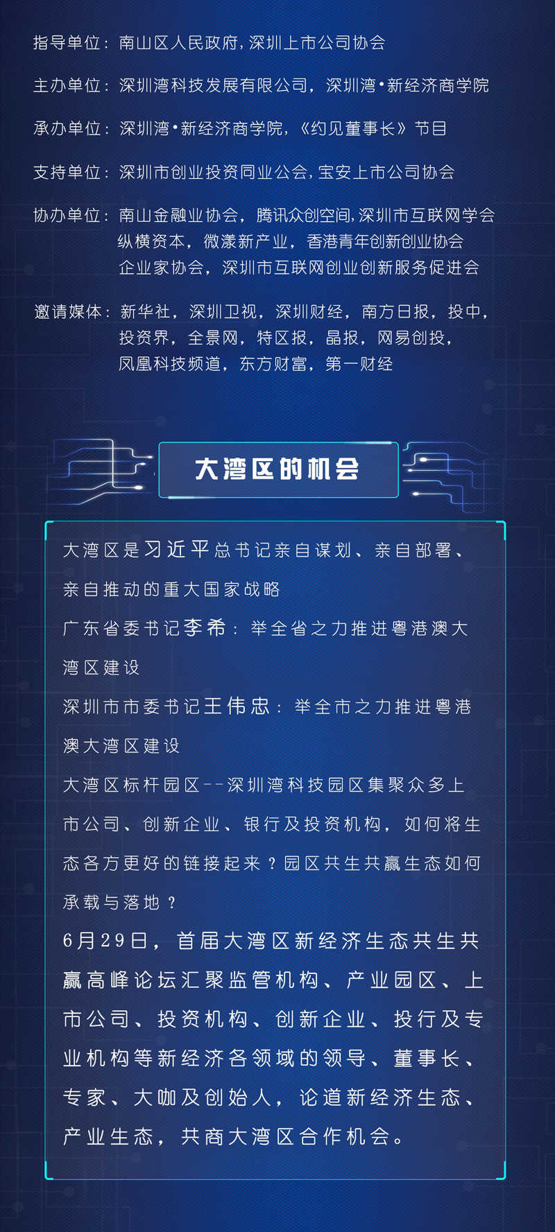 届时,论坛将聚焦于“大湾区标杆园区——深圳湾科技园区集聚众多上市公司、创新企业、银行及投资机构,如何将生态各方面更好的链接起来?园区共生共赢生态如何承载与落地?”等方面对园区产业生态助力粤港澳大湾区产业协同及大湾区发展新合作商机做全方位、深层次的剖析。同时多位行业大咖将结合自身经历、成功案例等,就“上市公司与投资机构如何在产业资源、产业资本、投资、并购等方面共生共赢”、 “针对科创板、创业板、港股及美股,新经济企业如何抉择?”等议题进行高层对话。为企业提供更多的商机与空间,充分实现园区生态链共生共赢,并通过深圳湾•新经济商学院——《约见董事长》私享会承载生态链接,具体落地。